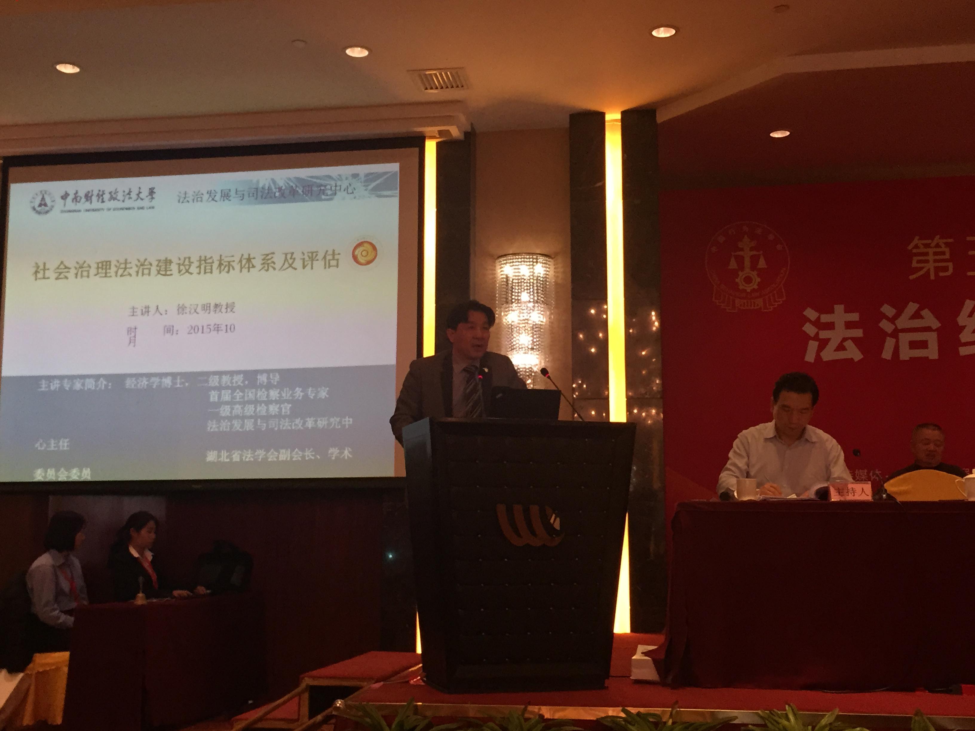 中南财经政法大学法治发展与司法改革研究中心主任、湖北法治发展战略研究院院长徐汉明教授应邀出席,并作主题发言。他首先向与会专家介绍中南财经政法大学法治发展与司法改革研究中心、湖北法治发展战略研究院创设的新型交叉学科-社会治理法学,该学科已初步形成完备的教材体系、理论体系、课程体系,创新人才培养模式。徐汉明教授接着从“社会治理法治建设评估的内涵、要素与功能,指标体系设计的基本原则与方法,社会治理法治建设指标体系的内容,社会治理法治建设的评估”四个方面阐述了“社会治理法治建设指标体系及评估”相关问题,得到与会专家高度认同。
