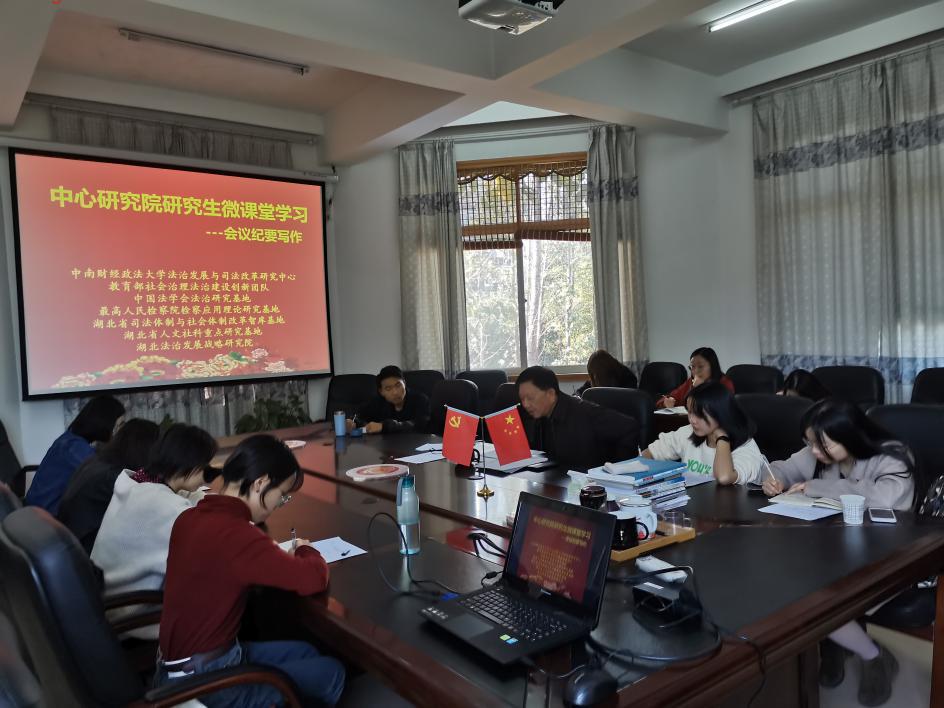 (通讯员:陈燕玲) 为进一步提高研究生会议纪要写作的技巧和能力,2019年11月14日,中南财经政法大学法治发展与司法改革研究中心于会议室开展了“中心研究院研究生微课堂学习”。此次课堂由徐柏才教授讲授,2019级社会治理法学硕士研究生参与。