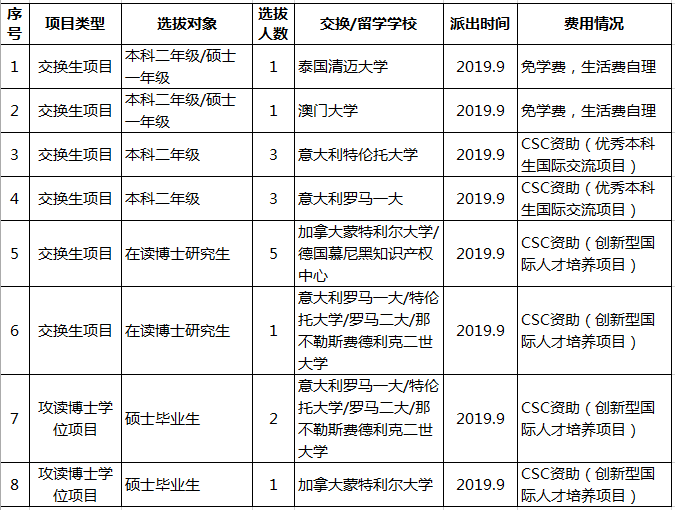 2019年上半年,法学院将集中安排学生出国(境)项目的选拔工作。选拔的项目包括:澳门大学交换生项目、泰国清迈大学交换生项目、国家留学基金委优秀本科生国际交流项目、“一带一路”中意法学创新型国际人才培养项目、新技术革命下学科融通型知识产权国际人才培养项目。项目具体信息请查阅法学院官网公告中的选拔通知。