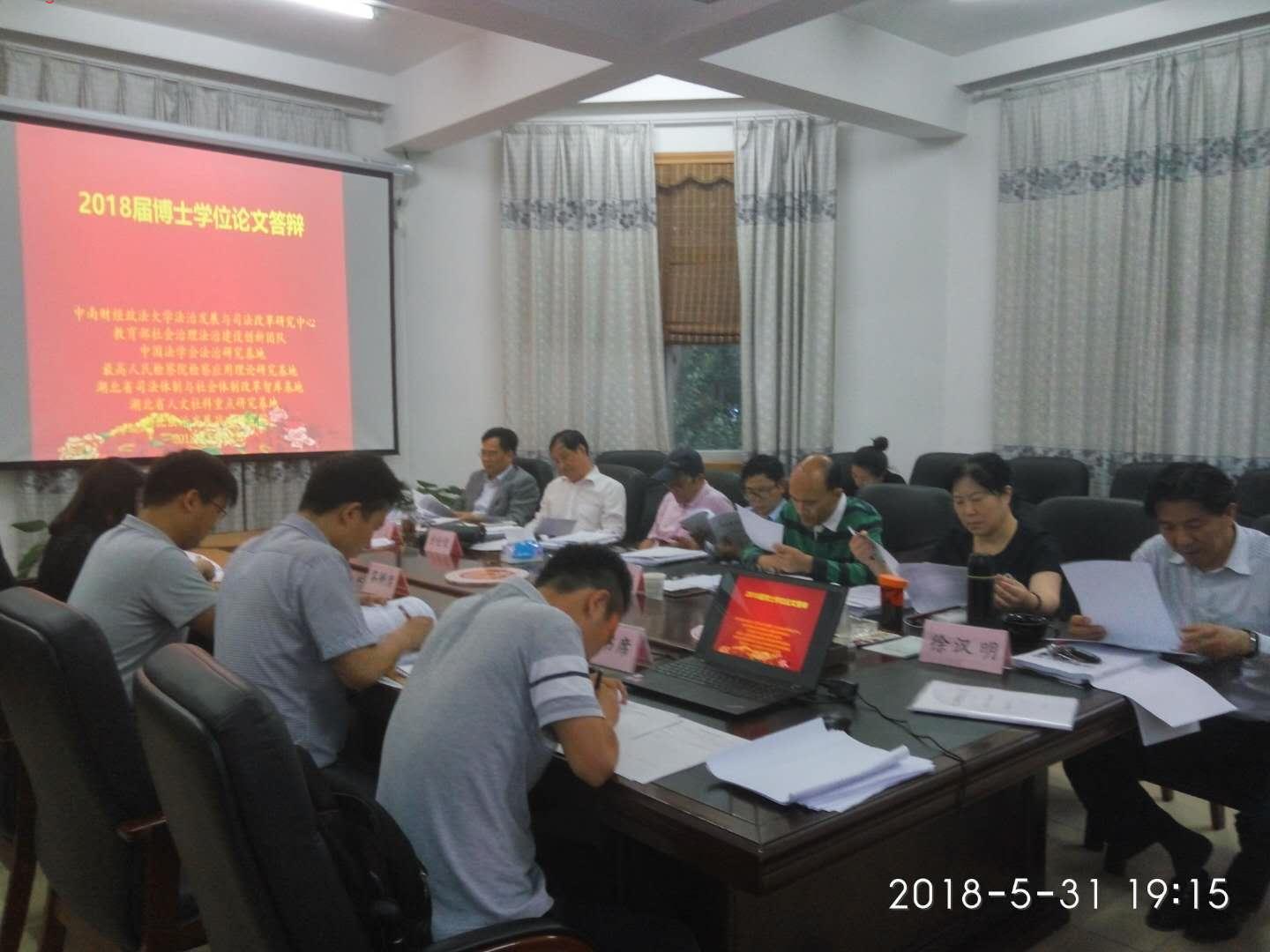2018年5月31日晚上,社会治理法学专业博士学位论文答辩在中南财经政法大学法治发展与司法改革研究中心二楼会议室举行。本次答辩由武汉大学汪习根教授担任答辩委员会主席,我校齐文远教授、姚莉教授、方世荣教授、徐汉明教授、张德淼教授及武汉大学江国华教授共同组成了答辩委员会。