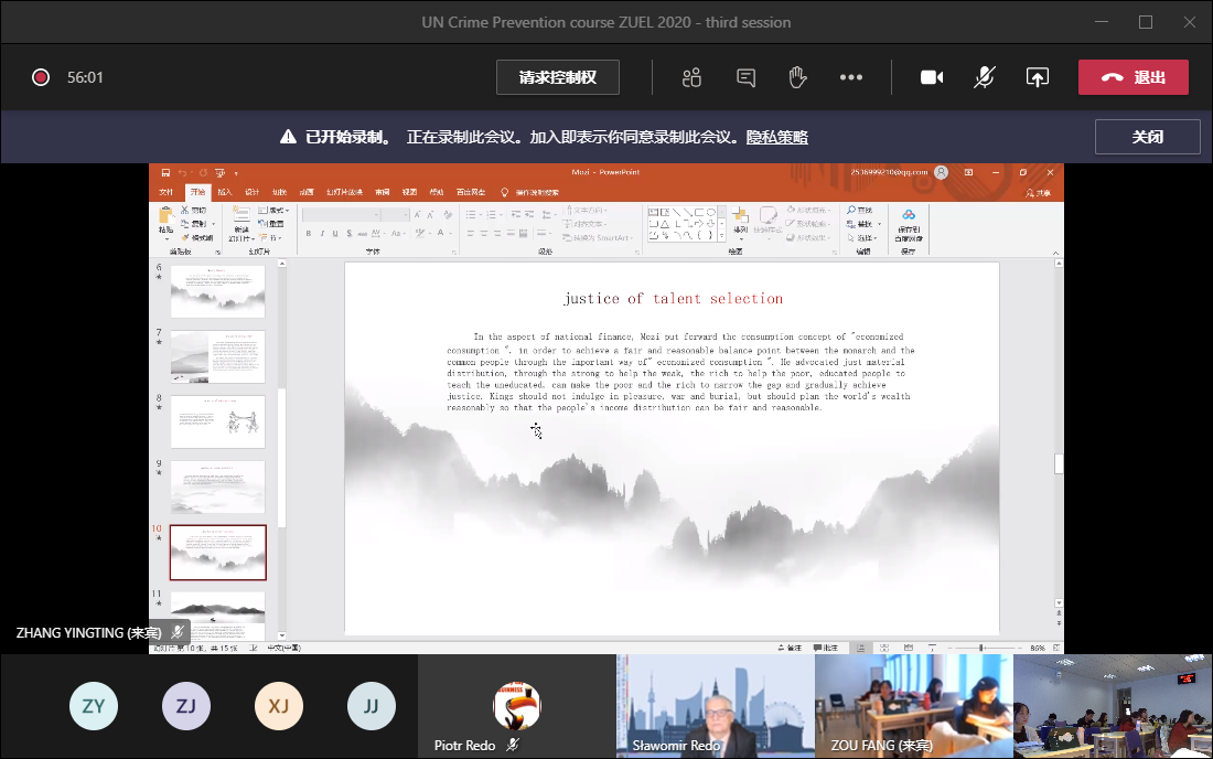 本网讯(曹永新 方雅)11月10日上午,中南财经政法大学法治发展与司法改革研究中心应邀特聘文澜学者、国际著名犯罪预防专家斯拉沃米尔·雷多教授为2019级“社会治理法学”硕士研究生讲授“联合国与犯罪预防”课程。他们根据学科教学特点,克服地域限制、时差困难、教学差异,全新开启以“线上授课”“线下学习”的全英文实时互动远程开放教学模式,此举开创了我国高校加强国际交流与合作、实施对外开放办学的先河。该中心旨在坚持国际化人才培养的教育理念,通过开放、多元、弹性、自主的办学机制和模式,帮助学生拓展国际视野,增强课堂教学的参与度、互动性和吸引力,提高课堂教学的针对性、有效性,最大限度地促进学生的全面发展与个性发展。