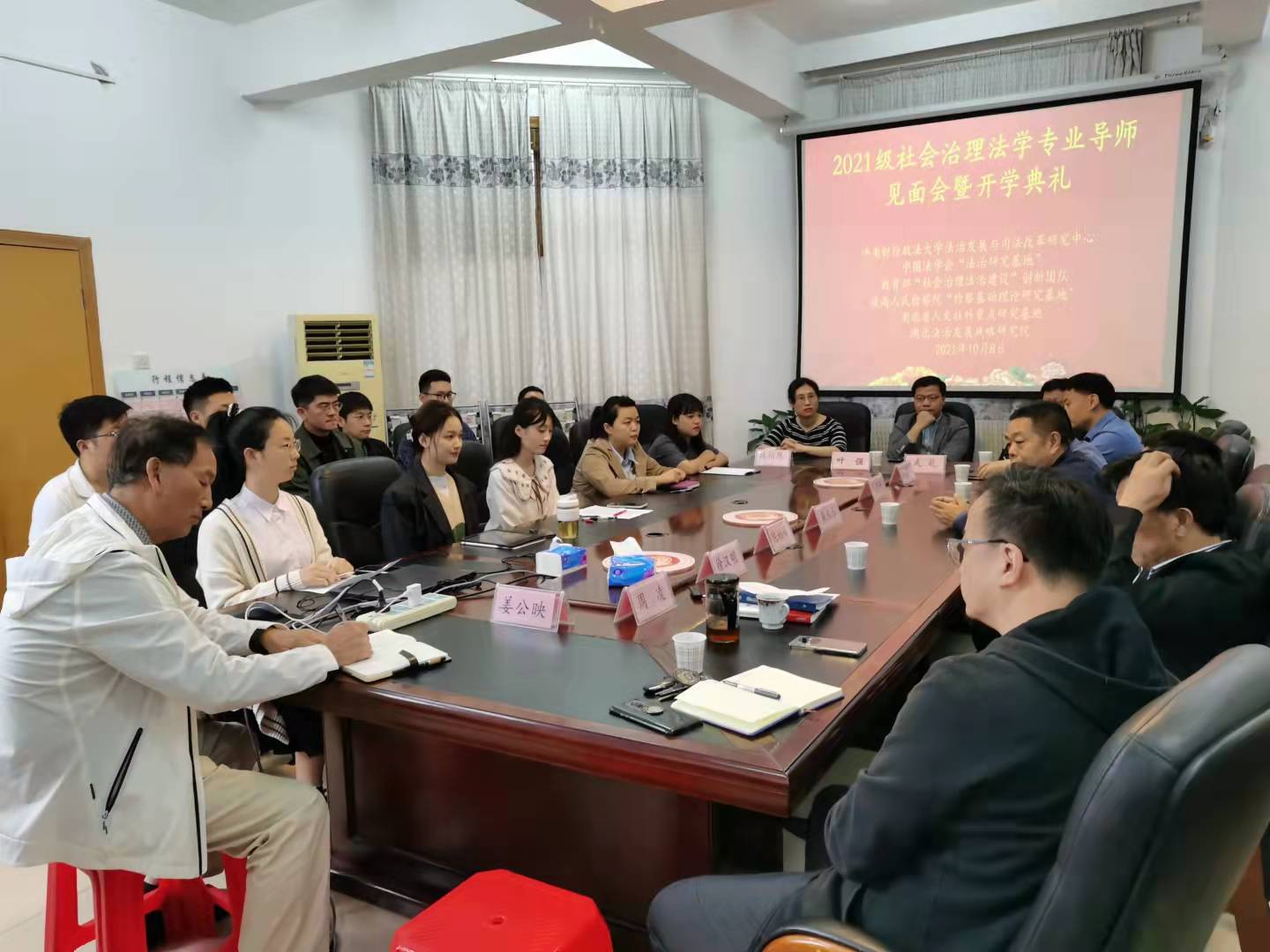 据悉,中南财经政法大学于2013年11月获批自设法学二级学科“社会治理法学”,2019年被教育部纳入全国高校系统创设的新文科目录之中。截至2021年10月,社会治理法学专业共培养博士28人,硕士51人,现已毕业博士研究生11人、硕士研究生22人。据教培部负责人丁莉莉介绍,2021年该校“社会治理法学”专业共招收硕士研究生10名,博士研究生2名。参加此次新生见面会的还有中南财经政法大学社会治理法学导师组成员戚建刚教授、董少平教授、武乾副教授、魏怡然讲师。“中心-研究院”全体工作人员、中南财经政法大学社会治理法学专业部分硕士、博士研究生也参加了此次见面会。