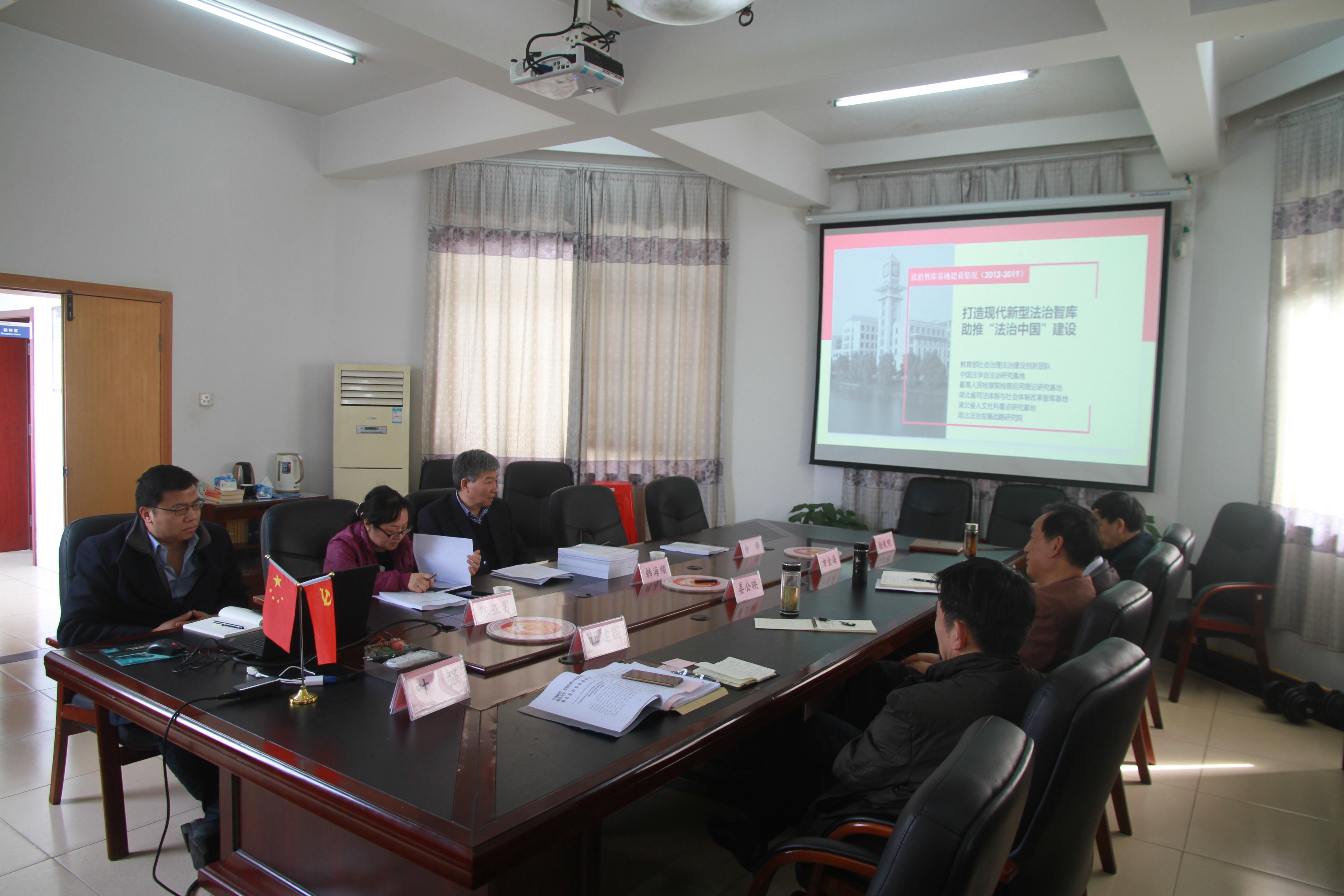 4月3日,湖北省法学会党组成员、办公室主任韩海顺,金融法学研究会秘书长余华博士,办公室调研员陈亚男组成的考核组一行莅临中心-研究院,开展“2018年度省法学会学科研究会工作量化考评”考核工作。中心-研究院党支部书记姜公映同志主持考核会议,中心-研究院顾问、首席研究员杜建国同志作工作汇报。