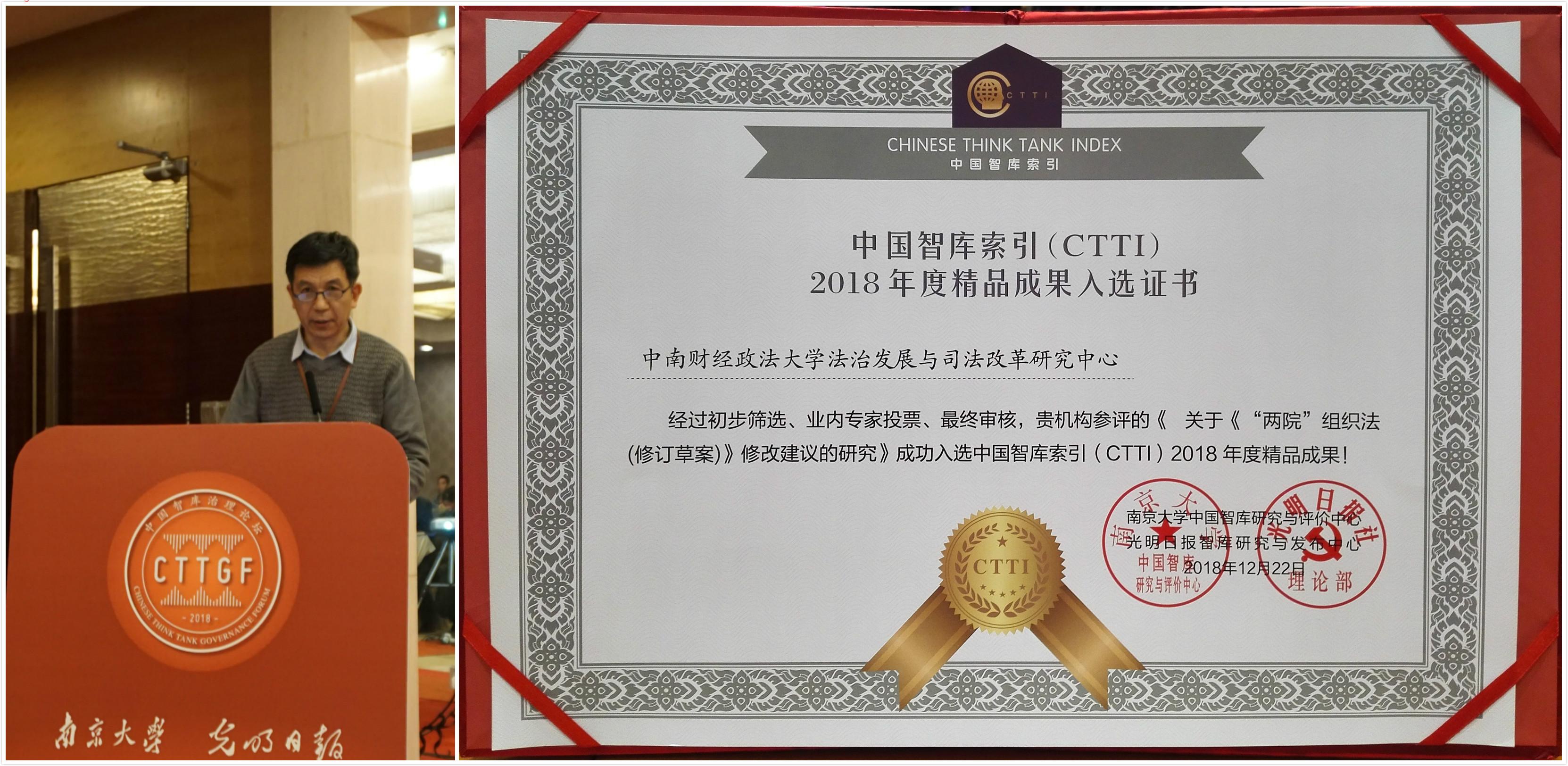 论坛上发布了《2018 CTTI智库报告》,并公布了CTTI高校智库百强榜。中南财经政法大学法治发展与司法改革研究中心成功入选CTTI高校智库A级榜单。