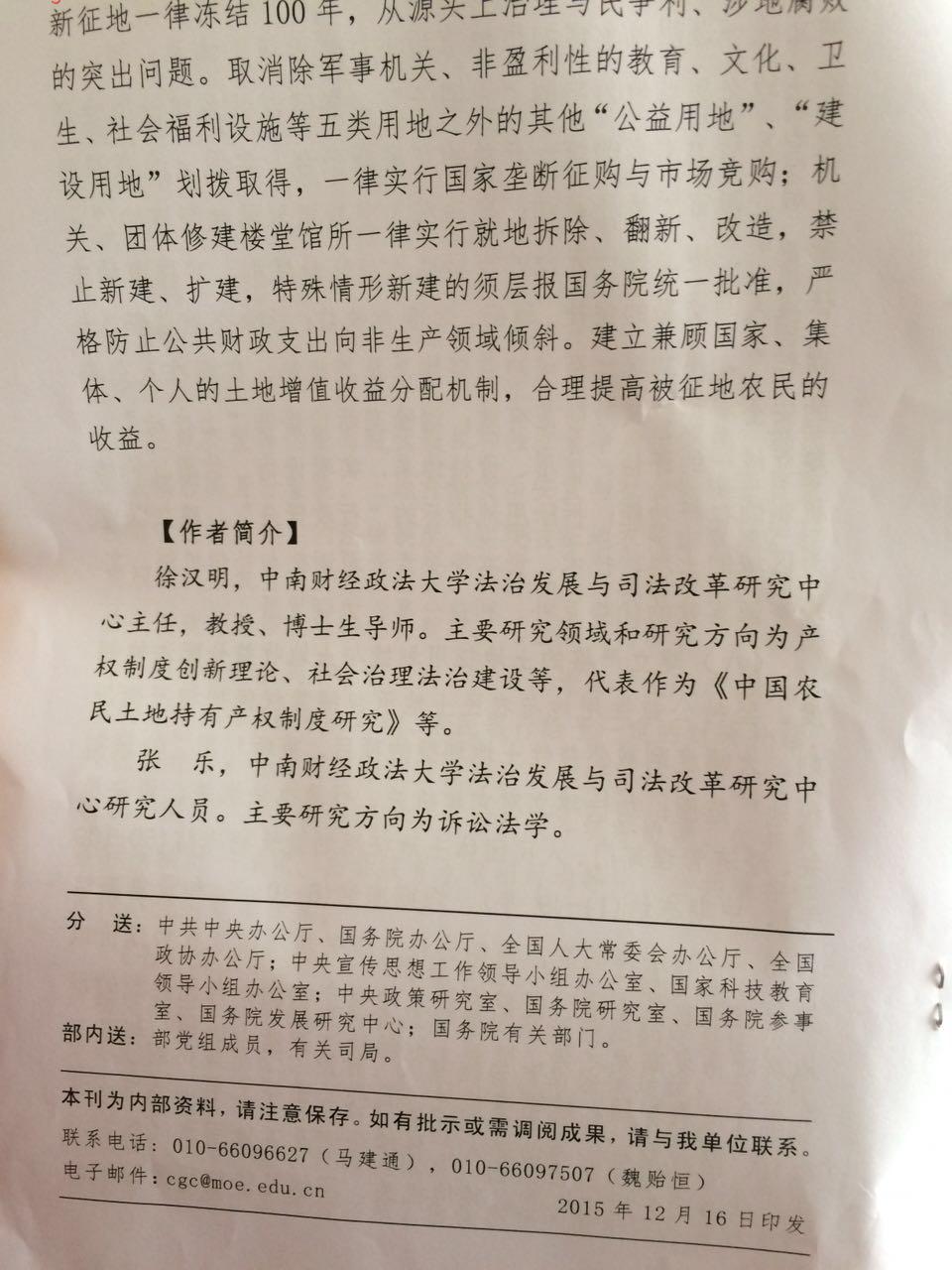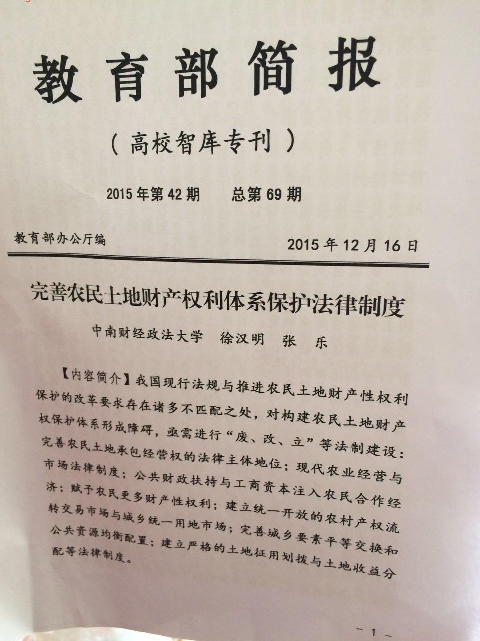 (本网讯 通讯员 曾海涛 张乐)2015年12月16日,教育部高校智库专刊2015年第42期,总第69期刊发中南财经政法大学法治发展与司法改革研究中心(以下简称)主任、湖北法治发展战略研究院院长徐汉明教授等科研人员的成果《完善农民土地财产权利体系保护法律制度》。