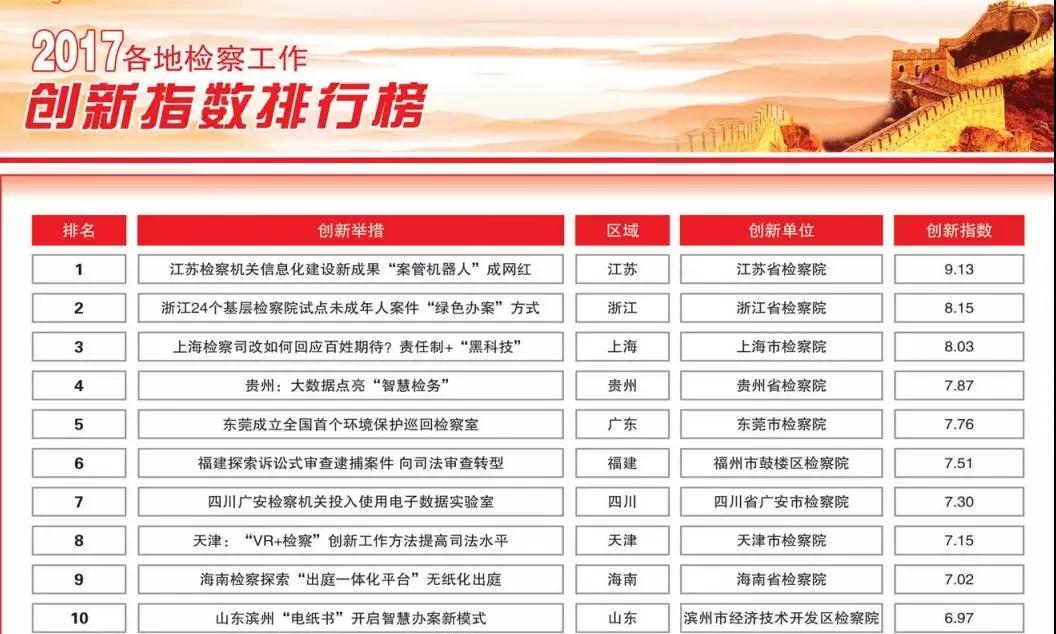 榜单数据由法制网舆情监测中心提供 制图/李晓军 2017年7月24日下午,最高人民检察院党组书记、检察长曹建明就检察机关服务保障“一带一路”建设在浙江省宁波市检察机关调研。程丁 摄 司法责任制改革全面推开、新旧办案机制平稳衔接、保护生态环境、加强未成年人权益保护、践行司法为民、服务国家发展大局……2017年是党和国家事业发展中具有重大意义的一年,同时,也是检察工作硕果累累的一年。 回顾刚刚过去的一年,全国检察机关坚持稳中求进工作总基调,牢固树立和贯彻落实新发展理念,深化司法改革,加强检察监督,强化队伍建设,促进经济平稳健康发展和社会和谐稳定,司法质量效率和公信力持续提升,人民群众对公平正义的获得感、对检察工作的满意度明显增强。 司法责任制改革全面推开 “我宣誓:忠于中华人民共和国宪法,维护宪法权威……” 2017年7月17日,228名最高人民检察院首批入额检察官,进行了庄严的宪法宣誓,标志着全国检察机关员额制改革全面完成,共遴选出员额内检察官8.7万余名。 司法责任制改革是司法体制改革的基石。过去,检察机关领导干部一般不直接参与办案,只负责审批案件和发表讨论案件意见。改革后,所有遴选出的员额内检察官都在司法一线直接参与办案,基层检察院85%以上的人力资源配置到办案一线,办案力量增加20%以上。 截至2017年9月底,全国地方三级检察院检察长、副检察长、检委会专职委员、业务部门负责人直接办理108.2万余件,合计占同期案件总数的48%。 “作为案件承办人,我来介绍一下案件诉讼过程。”2017年11月3日,最高检副检察长张雪樵与最高检民事行政检察厅检察官共同讨论一起民事诉讼监督案件。根据新型办案机制,张雪樵作为主任检察官,成为民行厅一个办案组的成员。 新的办案运行机制将原来的审批制改革为在检察委员会、检察长(副检察长)、检察官之间划分办案事项决定权,不同层级检察院分别将相应的办案事项决定权委托检察官行使,突出了检察官的办案主体地位,简化了审批环节和流程,案件流转和办理速度显著提升。海南检察机关一审审查起诉案件办理期限同比缩短17.4%,刑事申诉案件结案率提高21.4%。贵州对试点院员额制检察官所办结的3800件案件进行评查,发现司法不规范及司法瑕疵等问题较改革前大幅下降,降幅分别为78.9%、72.5%。 目前,全国四级检察机关基本实现了新旧办案机制的平稳衔接。 在办理一起盗窃案时,犯罪嫌疑人突然翻供了。放在以前,承办检察官刘莉会直接给出批准逮捕意见,捕与不捕由检察长审批决定。如今,她先是将笔录送到技术部门鉴定,又对嫌疑人进行测谎,结论出来后,才决定批准逮捕。 “司法责任制改革后,捕与不捕由承办检察官说了算,权力是大了,但责任也更重了,一点马虎不得。”上海市闵行区人民检察院检察官刘莉坦言,“谁办案谁负责、谁决定谁负责”的观念已深入人心。 “检察蓝”守护绿水青山 一辆装载20多吨粗苯的危化品运输车侧翻并发生泄漏,造成约5吨粗苯流入山西汾河支流大崖河中,对事发地水土环境造成损害。2017年12月20日,由山西省检察机关提起的首例破坏生态环境刑事附带民事公益诉讼案公开开庭审理。 2017年6月27日,全国人大常委会通过修改民事诉讼法和行政诉讼法的决定,正式建立检察机关提起公益诉讼制度。从试点到全面推开,检察机关提起公益诉讼在生态环境和资源保护方面,正发挥着越来越重要的作用。据悉,全面推开以来,截至2017年11月底,全国检察机关共发现生态环境和资源保护领域公益诉讼线索8151件,提起生态环境和资源保护领域公益诉讼82件。 本着“谁污染、谁治理”的原则,各地检察机关积极探索“专业化法律监督+恢复性司法实践+社会化综合治理”新模式,着力构建重点打击、修复补偿、源头治理并重的新格局,回应了人民群众的新期待。 在一起非法倾倒危险废物案中,公安机关以尚未发现具体涉案犯罪嫌疑人为由未予立案侦查。山东省莱芜市莱城区人民检察院经审查认定,公安机关不立案理由不能成立,遂监督公安机关立案侦查。最终,公安机关立案侦查并抓获王某等4名犯罪嫌疑人,并分别被法院判处刑罚,有效惩治了破坏环境资源犯罪行为。 据了解,2017年以来,检察机关开展“破坏环境资源犯罪专项立案监督活动”,充分履行法律监督职责,办理了一批群众反映强烈的严重破坏生态环境案件,建议行政执法机关移送了一批涉嫌犯罪案件。截至当年11月,检察机关共建议行政执法机关移送涉嫌破坏环境资源类案件3078件4034人,同比分别上升71%和65%;监督公安机关立案侦查2641件3315人,同比分别上升50.5%和58.2%。 其中,最高检挂牌督办7起重大污染环境案,包括天津市静海区万亩坑塘污染案、南京胜科水务公司污染环境案、甘肃祁连山系列环境污染案、广西来宾“3·14”非法跨省倾倒危险废物系列案等重大案件。最高检还派员对甘肃祁连山系列环境污染等案件进行现场督办指导。 各地检察机关纷纷依托巡回检察室、派驻检察室等形式,将监督触角延伸到行政执法一线。福建省人民检察院会同省河长制办公室,设立全国首个驻省河长办检察联络室,履行立案监督、提前介入等职能。湖北省石首市人民检察院建立驻石首麋鹿国家自然保护区、湖北长江天鹅洲江豚国家级自然保护区法律监督联系点,强化对