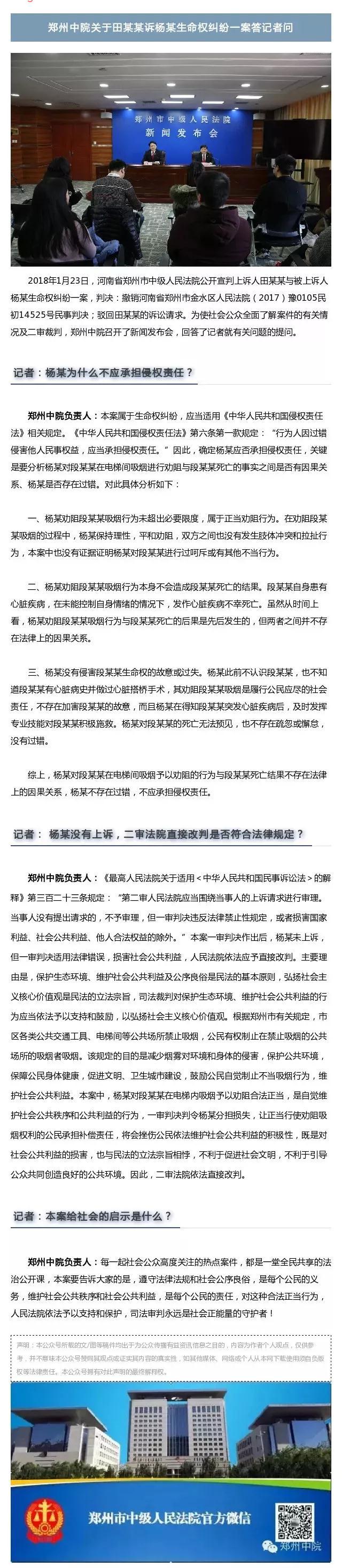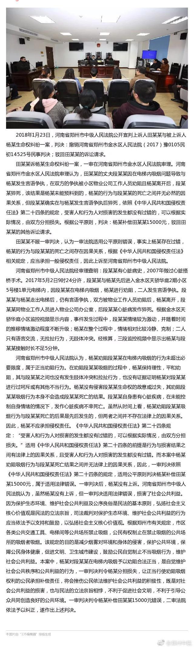 2017年5月,医生杨某因在小区电梯里劝一名老汉不要抽烟,引发争执,老人情绪激动心脏病发作离世。家属将杨某告上法庭,要求40余万元的赔偿。 河南省郑州市中级人民法院认为,本案中杨某劝阻吸烟行为与段某某死亡结果之间并无法律上的因果关系,因此,一审判决依照《中华人民共和国侵权责任法》第二十四条的规定,适用公平原则判决杨某补偿田某某15000元,属于适用法律错误。一审判决后,杨某没有上诉。河南省郑州市中级人民法院认为,虽然杨某没有上诉,但一审判决适用法律错误,损害了社会公共利益。 本案中,杨某对段某某在电梯内吸烟予以劝阻合法正当,是自觉维护社会公共秩序和公共利益的行为,一审判决判令杨某分担损失,让正当行使劝阻吸烟权利的公民承担补偿责任,将会挫伤公民依法维护社会公共利益的积极性,既是对社会公共利益的损害,也与民法的立法宗旨相悖,不利于促进社会文明,不利于引导公众共同创造良好的公共环境。一审判决判令杨某补偿田某某15000元错误,二审法院依法予以纠正,遂作出上述判决。 郑州中院关于田某某诉杨某生命权纠纷一案答记者问