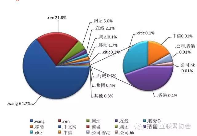 2015年全年,网站注册使用“.wang”、“. ren”、“.商城”、“.我爱你”、“.集团”等多个新通用顶级域名的备案数量持续增长,其中.wang占比64.7%,在新通用顶级域中占领半壁江山,其次为.ren和.网址,详细情况见下图。