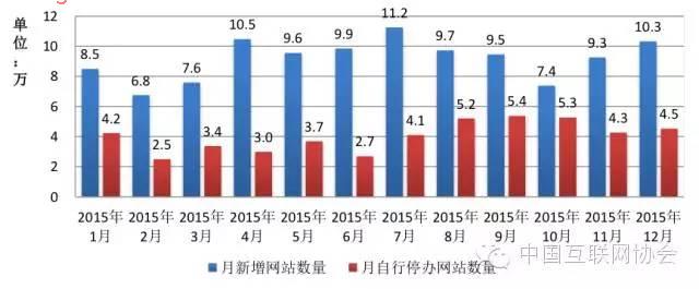 图1-7:2015年网站主办者新开通及自行停办的中国网站数量月变化情况