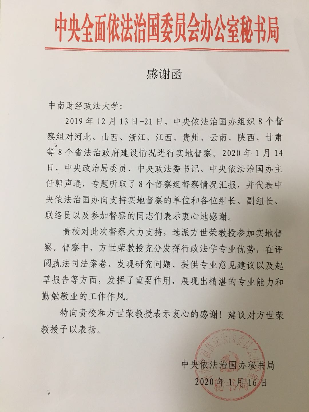 (通讯员 张倩)日前,中国行政法学研究会副会长暨中南财经政法大学法治发展与司法改革研究中心首席专家方世荣教授受到中央依法治国委员会办公室的致信表扬。