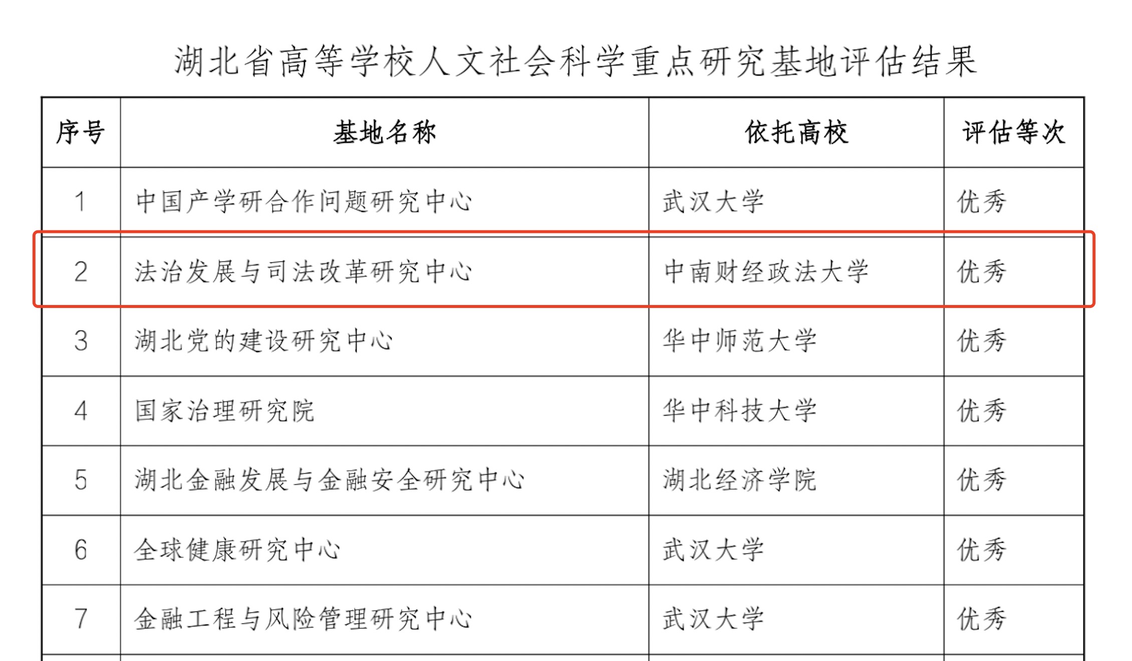 (付玉 报道)近日,湖北省教育厅公示了湖北省高等学校人文社会科学重点研究基地评估结果。中南财经政法大学法治发展与司法改革研究中心在全省144个人文社科重点研究基地中被评为优秀等次,位列第二。据悉,本次全省144个人文社科重点研究基地参评,其中优秀21个,良好30个,合格72个。