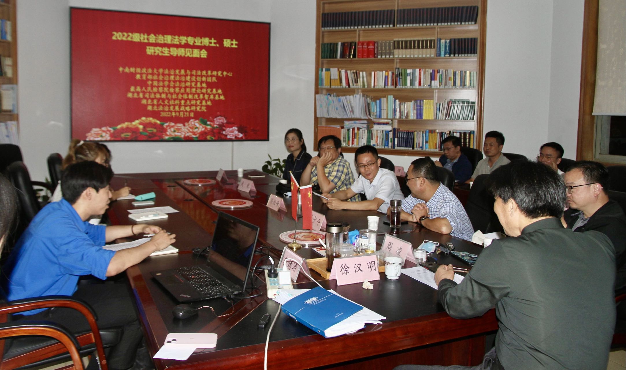(付玉 报道)9月21日晚,中南财经政法大学2022级社会治理法学研究生新生见面会于法治发展与司法改革研究中心暨湖北法治发展战略研究院(以下简称-中心-研究院-)二楼会议室举行,中南财经政法大学法治发展与司法改革研究中心社会治理法学学术带头人徐汉明教授、法学院院长陈柏峰教授、刑事司法学院警事科学系主任董少平教授、刑事司法学院周凌教授、法学院武乾副教授,魏怡然副教授等社会治理法学导师组成员参加了本次新生见面会。见面会由法学院院长、社会治理法学导师组组长陈柏峰教授主持。