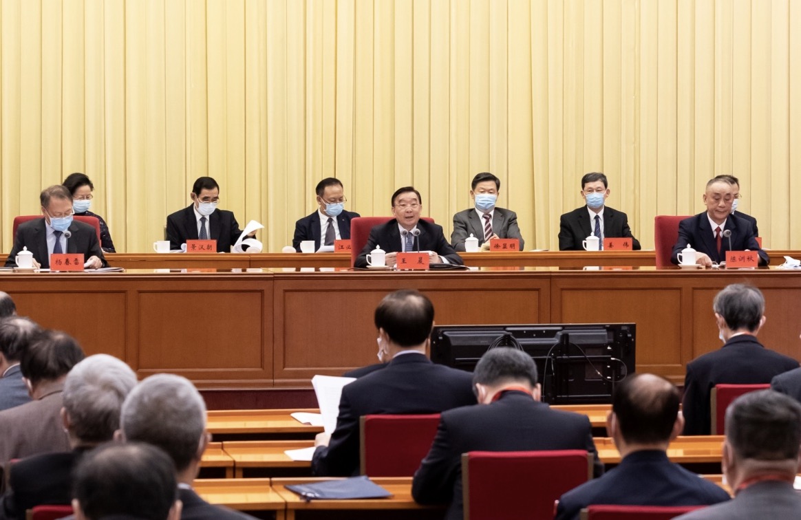 2月20日,全国人大常委会副委员长、中国法学会会长王晨在京出席中国法学会年度常务理事扩大会议并讲话。摄影/戎珊